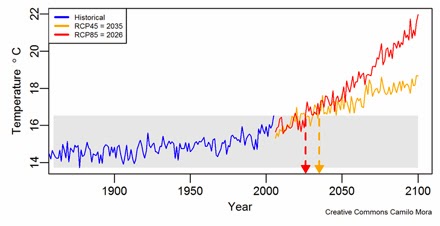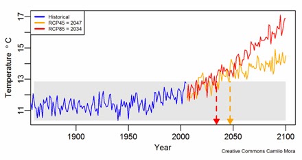 The key message to communicate is that we are departing from the climate we have known, and moving to a new climate. Points of departure A graphic way of demonstrating this is using resources from a paper published in October last year, “The projected timing of climate departure from recent variability”. The associated website includes data for many locations around the globe. Below is one projection for Melbourne. The research tracked average temperatures for each location from 1850 to 2005 (blue line) and established this historical temperature band (grey area). Then climate models for two emissions scenarios (RCP8.5 which is the high “business-as-usual” emissions scenario the world is current tracking on, in red; and a lower scenario, in yellow) were run to ask the following question: for each scenario, what is the year in which temperatures from that point on will all be higher than the current band. For Melbourne the answer for one climate model (Institut Pierre Simon Laplace Earth System Model CM5A-M) is 2034 (high emissions) and 2047 (medium emissions):