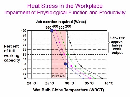In 2013 we experienced hottest day, week, month and year on record in Australia. During the 2012-13 summer high temperature records were set in every state and territory. And a new Climate Council report finds that over last 30 years, Melbourne heat-waves are occurring 17 days earlier, have become 1.5°C hotter, and the maximum temperature of the hottest day is 2°C higher, compared to 1950-1980. Extreme heat affects workplace productivity. As the next chart shows, for medium-exertion work, when the temperature increases from 30°C to 34°C (at 20% humidity), productivity halves. By the time the temperature is around 40°C, productivity approaches zero.