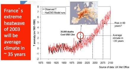 Devastating impacts And it is not just about air temperatures. Waters around Australia had hottest sea surface temperatures on record in February 2013. In the last four years, we have experienced unprecedented and out-of-season bush fires, a record two years of rain, repeated “1-in-a-100-year” floods, as well as record heat. And, of course, it’s not just Australia. One well-studied extreme event is the European/French heatwave of 2003, which killed 70,000 people, resulted in a 30 per cent drop in plant growth and caused $12 billion of crop losses, adding half a billion tonnes of carbon to the atmosphere. As the next image shows, in 35 years time, the 2003 extreme will be the average climate for that region: All of which suggests that even one degree of warming is not exactly safe. Yet carbon dioxide levels today are sufficient for one-and-a-half degrees of warming, and without rapid and deep emission cuts two degree will be unavoidable. We know quite a bit about a 2°C world from climate history research. Three million years ago in the mid-Pliocene, when greenhouse gas levels similar to today and sufficient for 2°C of warming, sea levels were 20 metres or more higher than today. Yet with a 5-metre rise, Miami would disappear and Central London, Bangkok, Bombay and Shanghai would lose most of their area. Rich food-growing deltas such as Nile, Mekong and Brahmaputra inundated. At 2°C warmer, every year in Australia would likely be hotter than the hottest year up to 2005; there would up to a doubling of days over 35°C, and roughly a doubling in extreme fire days. The barrier reef would be lost, Kakadu salinated, Murray Darling water flows down by about a quarter, and seas would be on the way to rising several metres in a nation where 85% of the population lives within 50 Kms of the coast. In Australia, more than $200 billion worth of coastal assets and 700,000 properties are at risk from a sea level rise of just 1.1 metre. What more can we do to connect the dots between today’s extreme experiences and tomorrow’s world? |