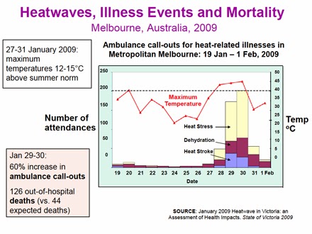 During this extreme heatwave, preliminary estimates are that there were 140 additional heatwave deaths, many of whom we should call victims of climate change. In 2009, the heatwave leading up to Black Saturday claimed twice as many victims (374) as the fires themselves (173), with ambulance calls-outs spiking once temperatures hits 40°C, as this chart of ambulance call-outs at that time shows: