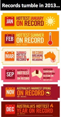 Some of these ideas were canvassed at greater length in “As Tony Abbott launches all-out war on climate action, what’s the plan?” This post is about the first part of my presentation, on connecting climate extremes that are being experienced today to an understanding of what climate change will mean for people in the future. A new climate regime One starting point is to make it clear that we are moving to a whole new climate that will be a new experience to people wherever in the world they live. Carbon dioxide levels – the principal determinant of changing temperatures – are higher than at any time since modern human evolved, and likely higher than for the last 15 to 20 million years, so we are creating a new climate regime that humans have never experienced. Climate change manifests not as a slow, imperceptible and smooth change, but as a series of extreme events that become increasingly frequent till they become the new norm. So these extreme events – record temperatures, longer and more intense heat waves, changing rainfall and drought patterns – are all a preview of what life will be like every day in a few decades time. In January, Melbourne set two new extreme heat records: