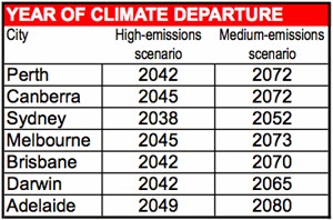 When all models are taken into account and averaged, the results for Melbourne are 2045 and 2073. To summarise, sometime from 2045 onward in Melbourne, even the coldest years will be hotter than any year up to 2005. So this is a way of showing the points of departure from the current climate regime, and the movement into a whole new higher, hotter regime. A table of climate departure years for major Australia cities is shown at right. And here is the Sydney result for the Institut Pierre Simon Laplace Earth System Model CM5A model: