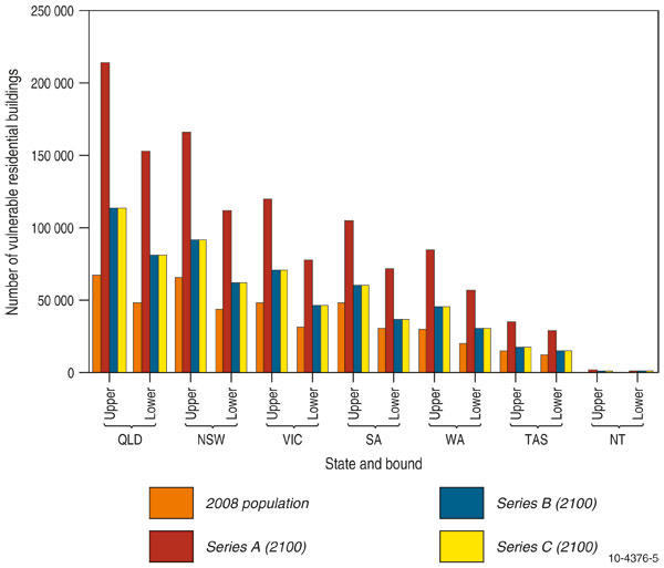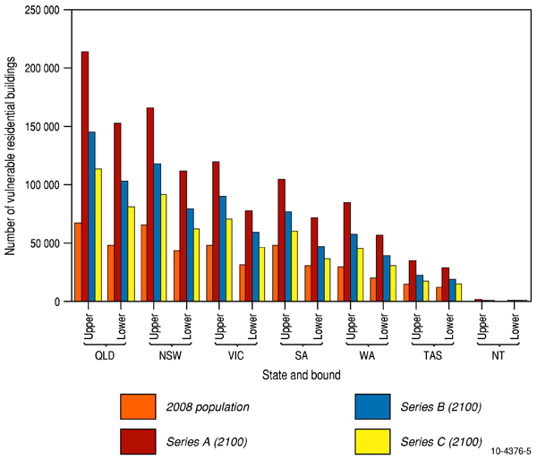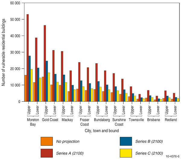 Figure 7 shows the number of vulnerable residential buildings (from inundation and recession) under the 2100 projected sea-level and current (2008) population as well as the ABS Series A, B and C population projections. Potential vulnerability is significantly increased by the ABS Series A and B population projections. In fact for the Series A projection the increase in sea-level has a smaller impact on the vulnerability compared to the increase in population (see figure 7; note the additional part of the bar above the level for 2100 sea-level and 2008 population). For the Queensland region, Figure 8 shows the number of vulnerable residential buildings (from inundation and erosion) for the most impacted LGAs (considering the 2100 sea-level with the 2008 population, and also ABS Series A, B and C population projections). The south-east corner of Queensland where most of the vulnerability for residential infrastructure is located (see figure 8), is currently experiencing large population growth and an associated building boom. All along the entire eastern seaboard, including South East Queensland, adaptation to rising sea-levels is becoming a priority for local councils battling to implement sound controls as increased population puts greater pressure on the coastal zone.