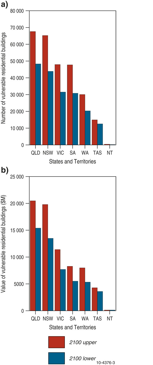 Table 1. Number and value of residential buildings vulnerable to the impacts of coastal inundation, recession and the combination of inundation and recession for all states and the Northern Territory. The values consider a sea-level rise of 1.1 metres by 2100 in combination with a sea-level increase from a one in a 100 year return-period storm surge event (for New South Wales, Victoria and Tasmania) and the spring high-water tide for all other states. Values are based on the ‘upper’ estimates derived by localised validation/comparison with LiDAR elevation data.