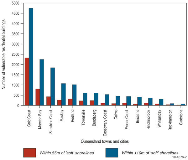 By identifying soft and potentially erodible shores the Smartline was used to develop Zones of Potential Instability (ZPI). Using the sea-level rise scenario outlined on page 5, the ZPIs were used to generate a new potential shoreline position. This shoreline position was integrated with NEXIS to determine the number of buildings which would be vulnerable to recession. Utilising the simple Bruun Rule (Bruun 1962) for recession (that is, recession distance equals 100 times the sea-level rise height) as the risk-averse scenario and half this distance as the risk-tolerant scenario and based on a sea level rise of 1.1 metres by 2100, we assumed that ‘soft’ shorelines could recede between 110 and 55 metres inland respectively. Figure 3 shows the number of residential buildings (by state or territory) located within 55 and 110 metres of ‘soft’ shorelines The number of residential buildings in Queensland (by local government area or LGA) located within 55 and 110 metres of ‘soft’ shorelines is shown in figure 4. Across Australia, nearly 39 000 residential buildings are located within 110 metres of potentially erodible shorelines, with nearly 40 per cent of those buildings located in Queensland. There was no consideration of any existing, planned or future protective structures associated with the estimates of buildings at risk by 2100. Local sediment processes, such as accretion, were not considered.