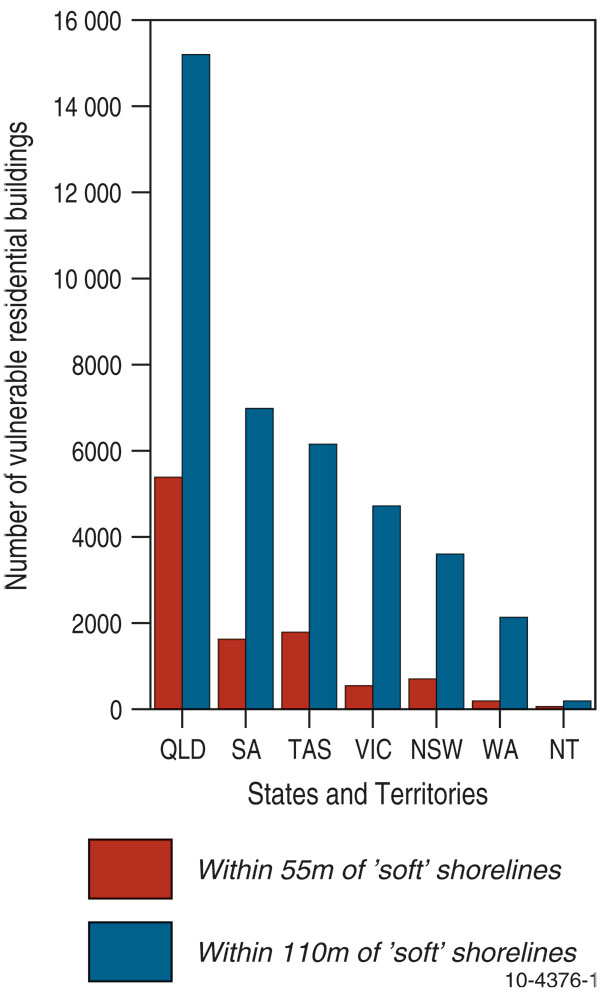 Figure 3. Number of residential buildings (by state and territory) located within 55 and 110 metres of ‘soft’ shorelines (simulating the average and maximum extents of coastal recession by 2100).