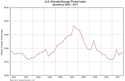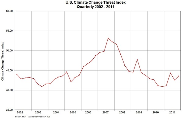 In the USA (and Australia too), concern about climate change (as measured by the climate change threat index – see chart below) peaked around 2007. Research studies find that media coverage of climate change directly affects public concern levels, and that the actions of political elites turn out to be the most powerful driver of public concern. Concern in the USA was at its heightat the time of media focus on the IPCC’s 2007 fourth assessment reports and Al Gore’s “The Inconvenient Truth”.