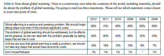 Looking at all these factors, it’s not difficult to see (following Hugh Mackay’s analysis) that public support for action was at its height as Labor came to power in December 2007 and has been sliding ever since 2008, abetted by the denier and Murdoch media campaigns, the GFC and Labor’s incompetence. A recent Lowry Institute poll reflects this view (below). Walking Against Warming was probably at is biggest and brightest in 2007-08. Commitments to carbon pricing and increasing the RET were made before Labor won power.