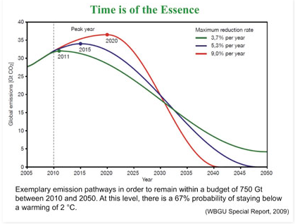 A delay in reaching peak emissions makes the task more challenging, even for the unsafe 2-degree target. A presentation made by Hans Joachim Schellnhuber to the 4 degrees or more: Australia in a hotter world conference in Melbourne in 2011 showed that if emissions do not peak till 2020 (red line), then the maximum reduction rate is nine per cent per year. On present indications 2020 is being optimistic. Even for the 2C boundary it is four per cent a year from now.