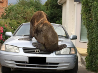 Australian fur seal weighing 200kg wanders down Tasmanian street, squashes car