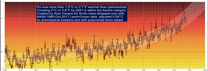 For some time, it has been warmer than the 1.5°C guardrail that the Paris Agreement promised should not be crossed. This conclusion follows from above analysis of NASA land+ocean data 1880-October 2017, adjusted by 0.59°C to cater for the rise from preindustrial and with a trend added that also indicates that the global temperature looks set to cross the 2°C guardrail soon, with 2021 falling within the margins of the trend line.