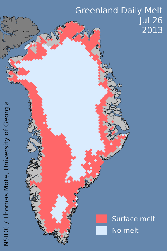Greenland. This image is from the US National snow and Ice Date Centre and shows melting on Greenland for 26 July 2013, with melt area exceeding 40% of the surface area. This follows a record-breaking melt year in 2012, when in July NASA released findings showing surface melt of the Greenland ice sheet of more than 97 per cent over a few days, a rate unprecedented in the era of satellite observation. And in late July 2012, the reflectivity of the Greenland ice sheet, particularly at the high elevations that were involved in the mid-July melt event, had declined to record lows. This indicated that the ice sheet was absorbing more incoming solar energy than normal, potentially leading to 2012 being another record melt year in a long-standing trend of increasingly higher melt seasons.